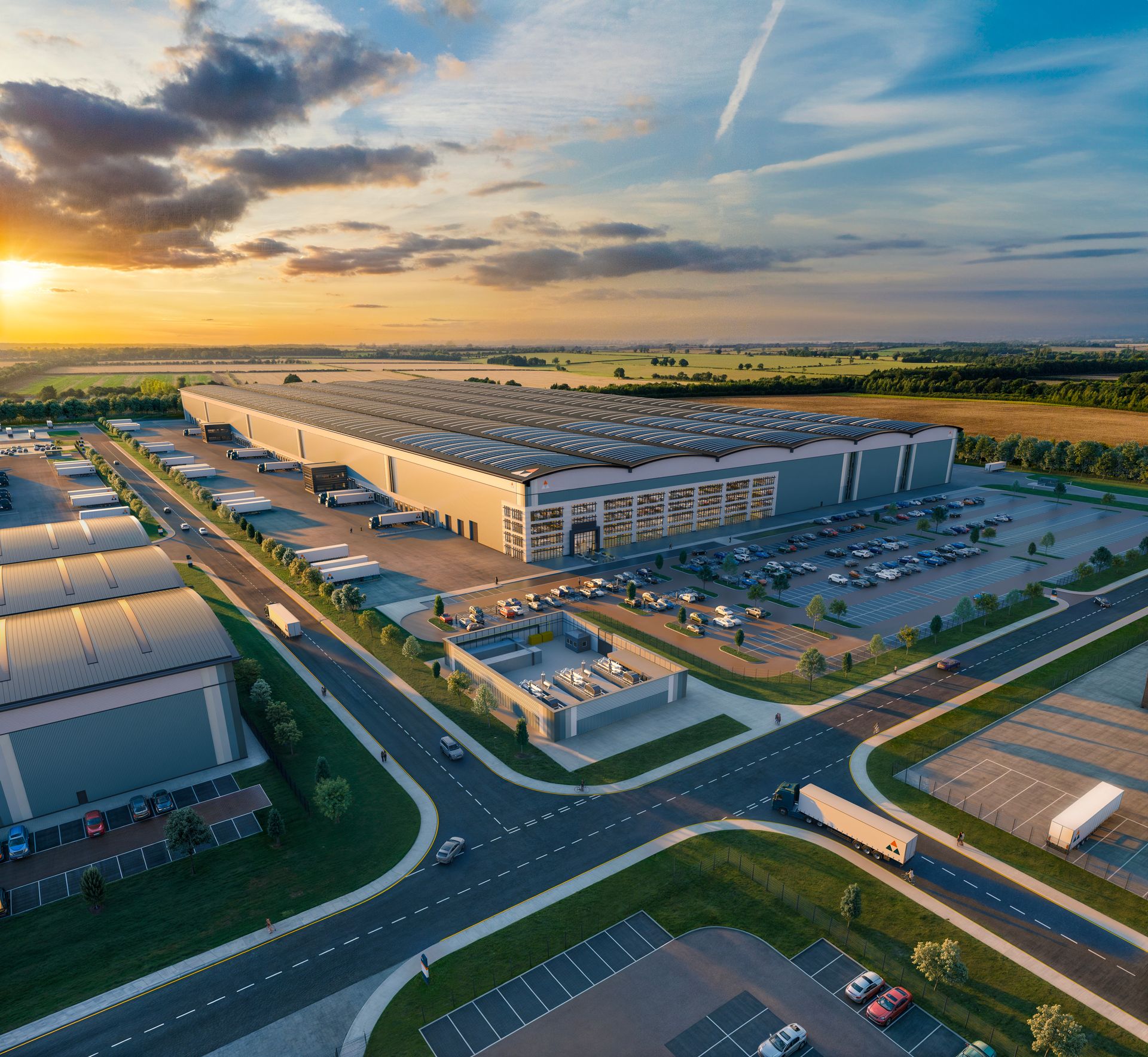 Drone view CGI we did for Tritax Big Box’s Symmetry Park Ardley - Highlighting the schemes beauty in a dramatic dusk shot | © Blink Image