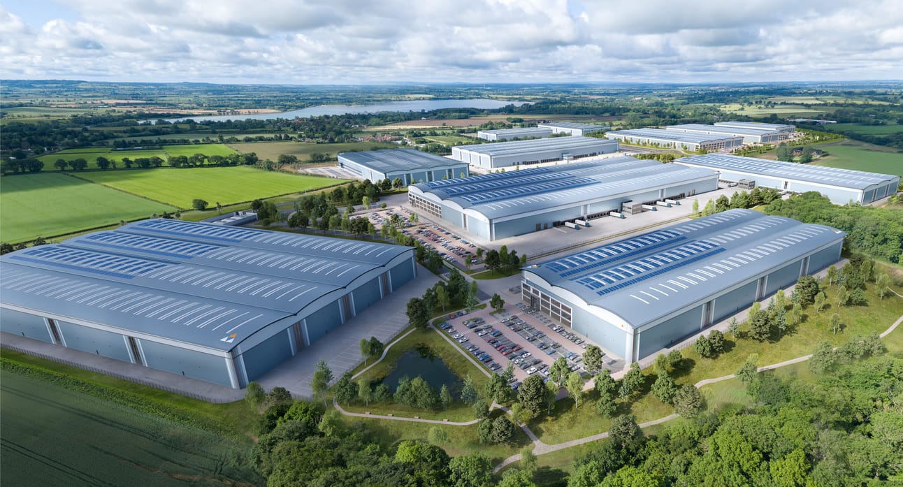 Example: A high-level view of a high-end logistics development showcases its layout, green spaces, and proximity to local amenities and neighbouring green spaces, making it ideal for brochures or investor pitches.