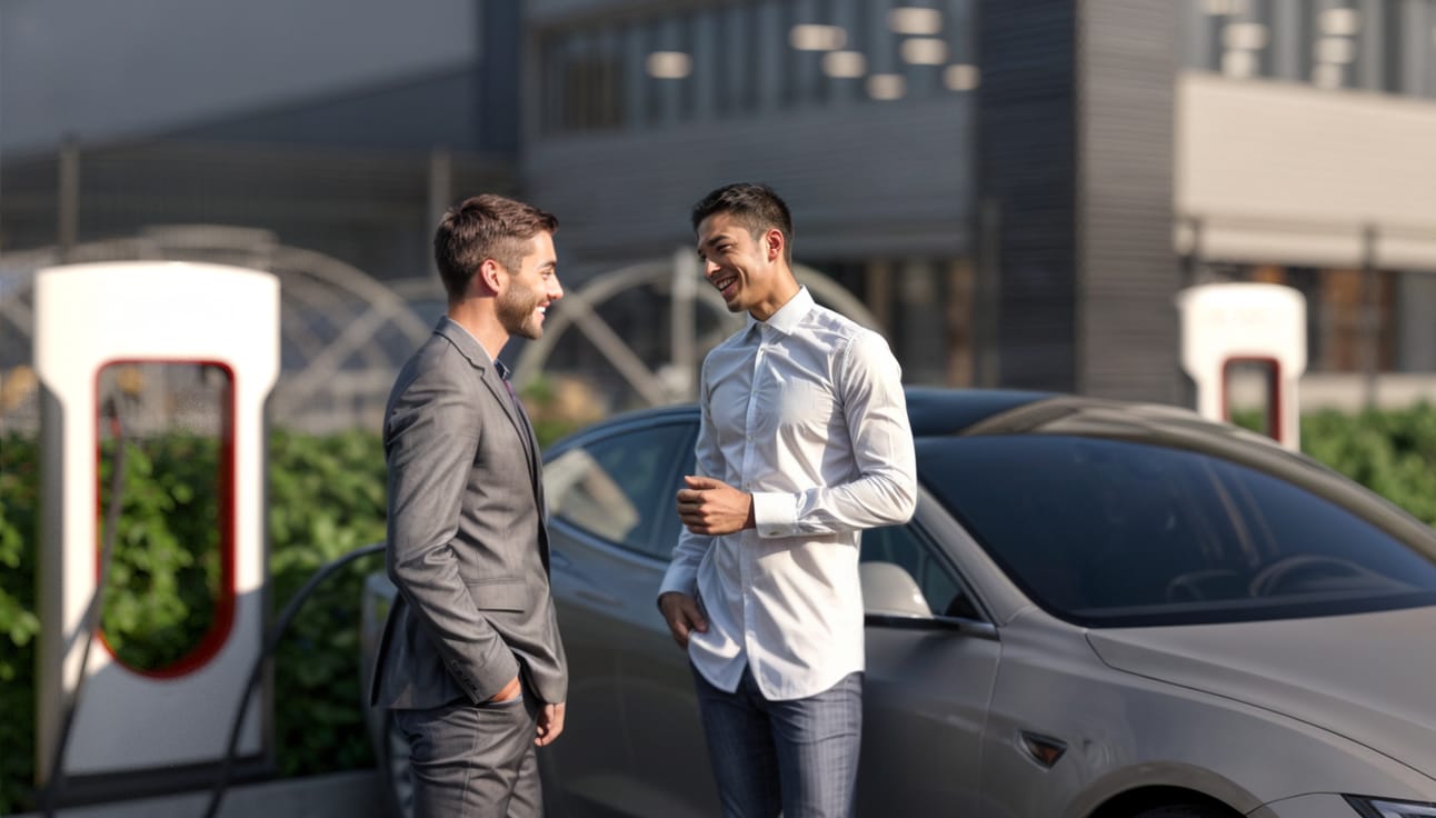 Example: A detail + lifestyle shot of a conversation between two members of staff next to their car which is clearly an EV, highlighting on-site facilities and sustainable concepts behind the design, resonating deeply with prospective buyers or tenants.