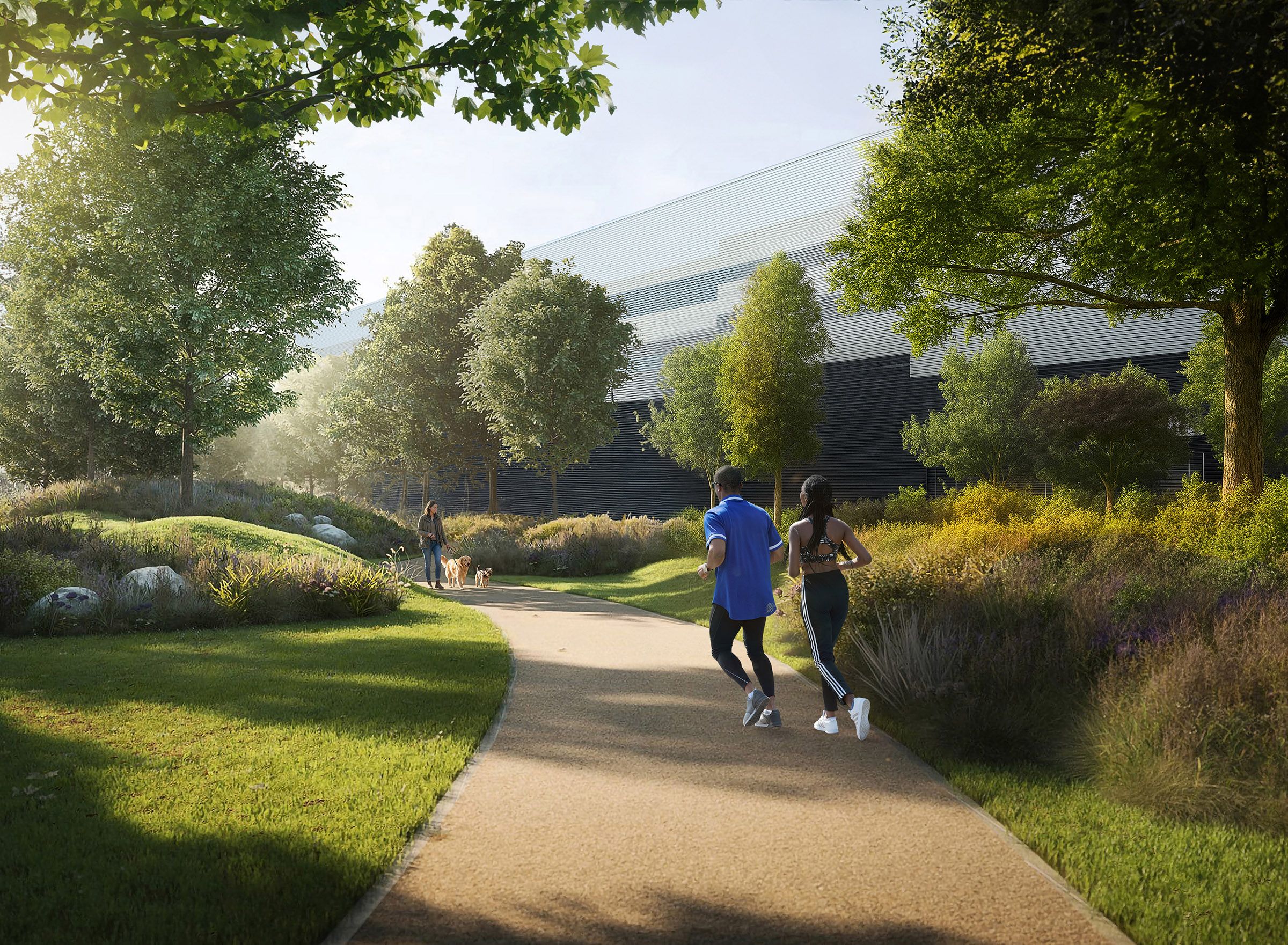 A landscape-led image — a view from a public footpath, with planting in the foreground and the building sitting behind a green buffer — is doing a specific job. It is not trying to promote the development. It is demonstrating how it fits.