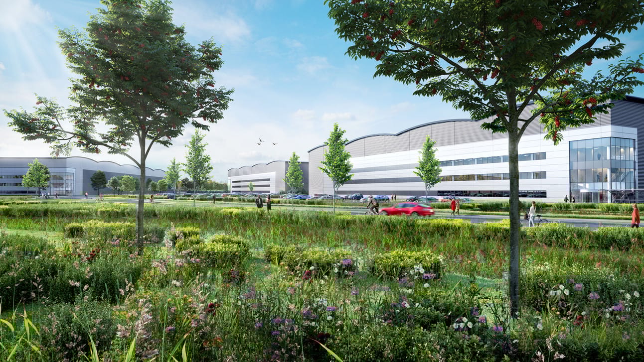 Extract from a film we created for Tritax Symmetry Park, showing planting, trees and wellness areas building from the ground up © Blink Image Limited