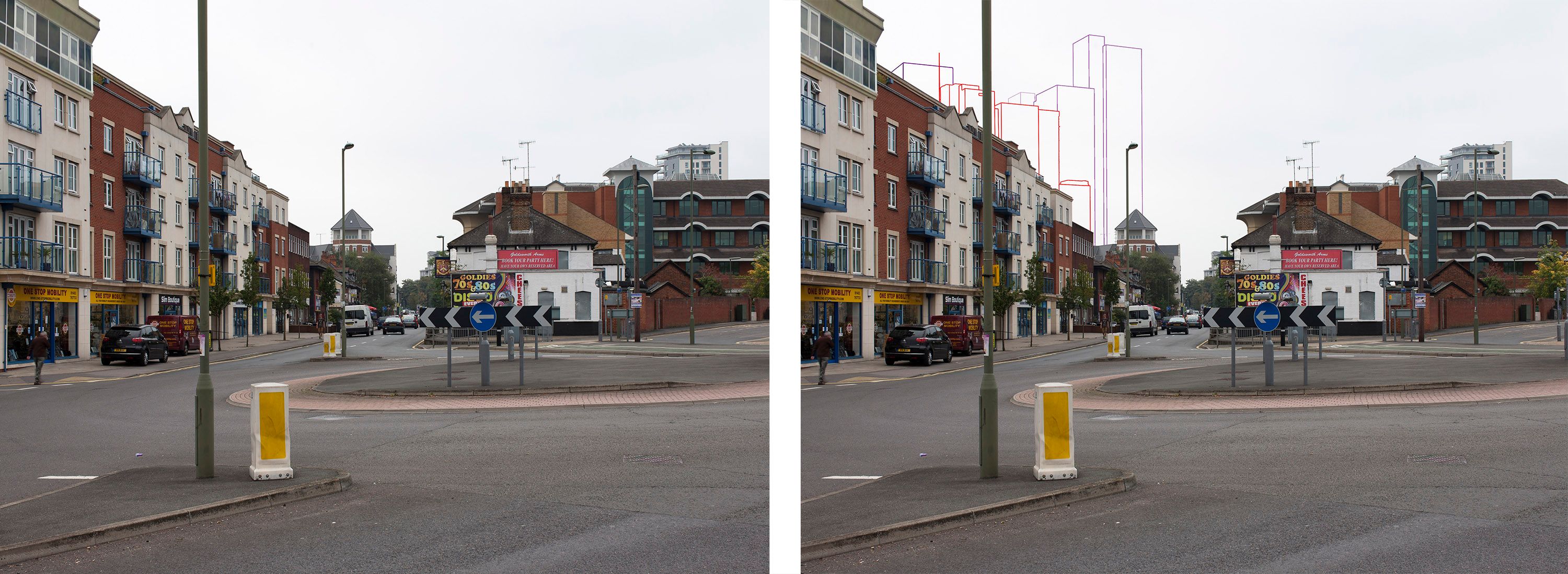 AVRs are produced to different levels depending on what the application requires. A simple wireframe overlay can be sufficient to assess basic massing against a skyline. A fully rendered photomontage - matching photographic conditions with precision - is needed where the visual character of a scheme is under scrutiny or where public consultation demands a high degree of realism.
