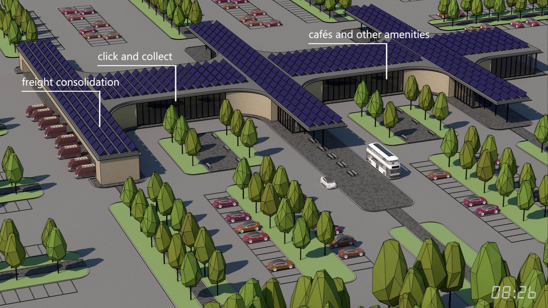 Sustainability communicated through the design itself - solar coverage, drainage strategies, biodiversity planting - rather than graphic overlays.